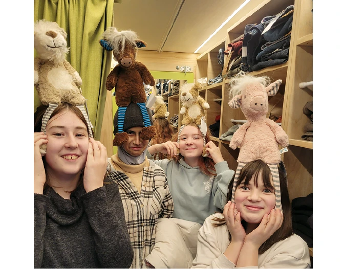 In der Mittagspause konnten sich interessierte Schüler*innen und Kolleg*innen das Gefairt von innen ansehen. Die Umkleidekabine und die Kuscheltiere fanden großen Anklang. Der Arbeitskreis „Fairtrade School“ dankt Frau Nauber herzlich für ihr besonderes Engagement und ihren Besuch an unserer Schule. Ein großes Lob geht auch an alle Schüler*innen, die sich mit viel Interesse und Neugier an dieser Aktion beteiligten.